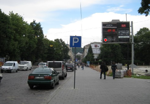 В сторону центра, справа, перед входом в цирк. Рядом воинская часть, школа, сеть магазинов, одна из центральных магистралей города